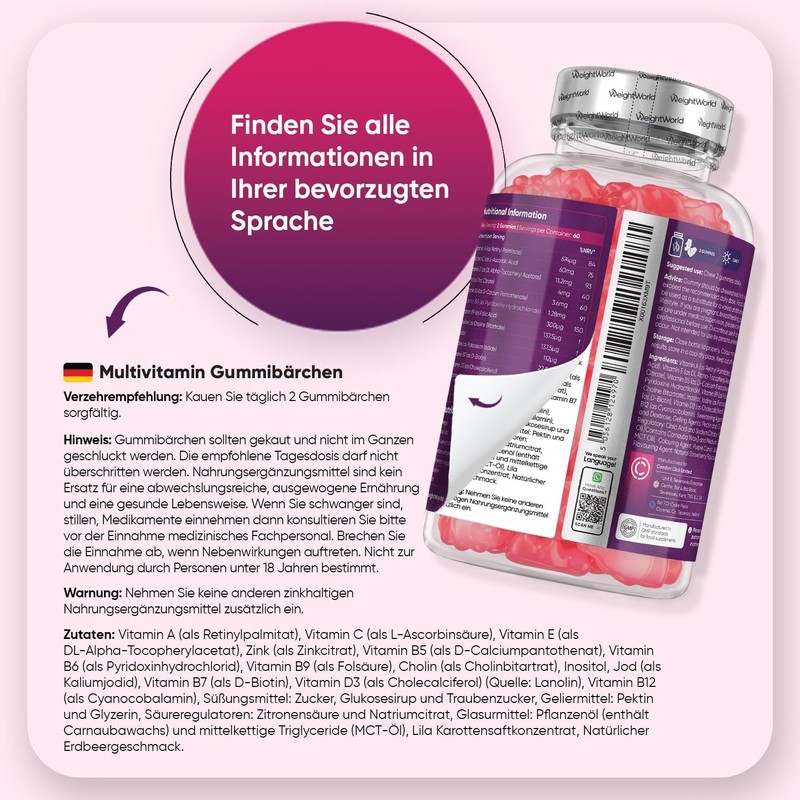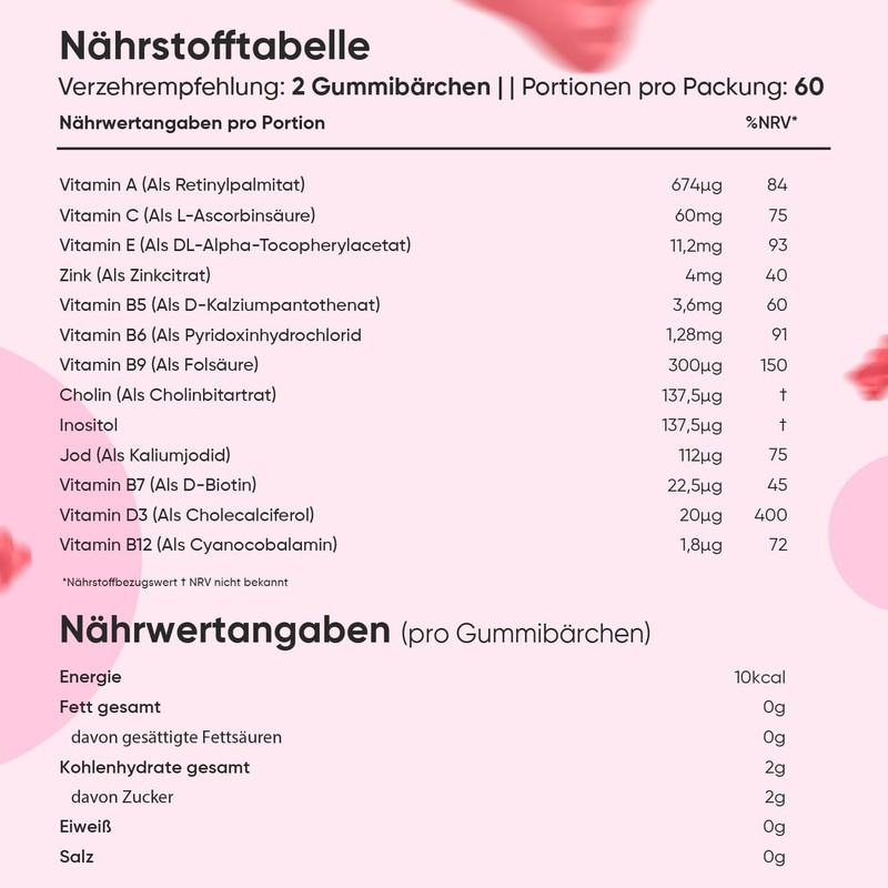 - Multivitamin gummies - Our multivitamin gummy bears are the ideal addition for every day. With just two gummy bears a day, you will be supplied with all the necessary vitamins and minerals. A simple and delicious alternative to other multivitamin preparations that can contribute to your well-being with carefully selected ingredients.
