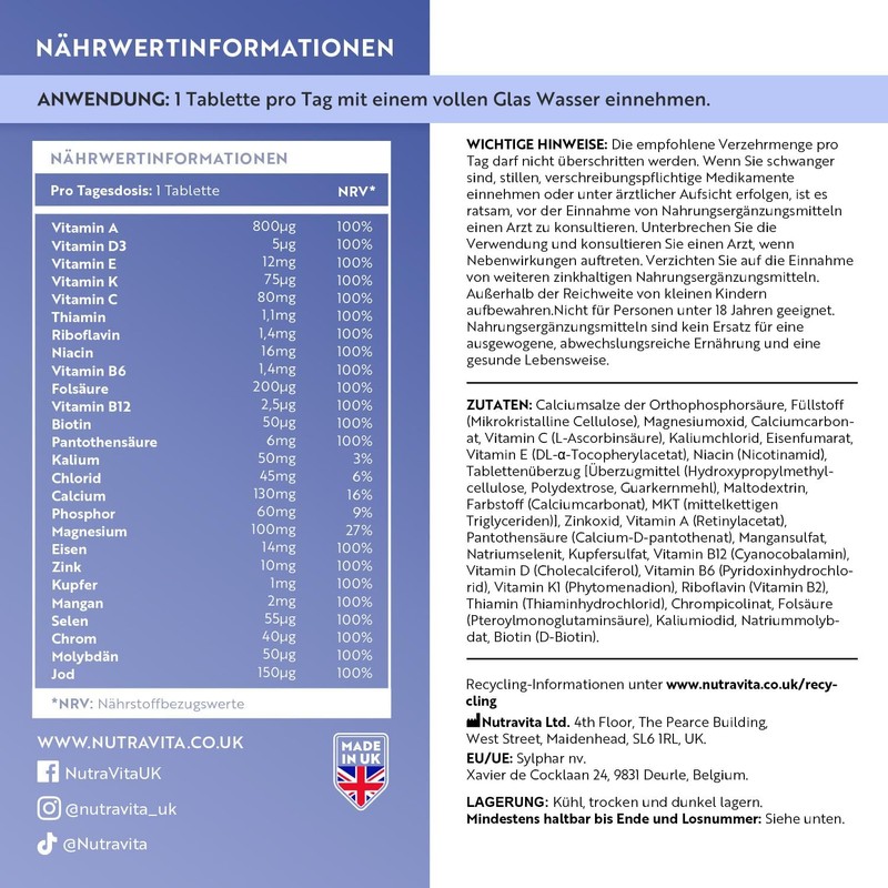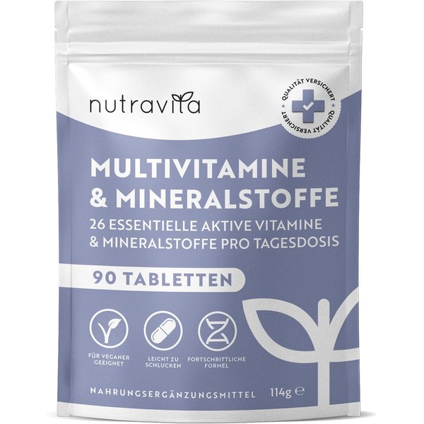 • ✔ Why multi vitamins and minerals from Nutravita? - Our multivitamin tablets high dose contain 26 active vitamins and minerals carefully selected to support you daily. The multivitamin supplement comes with a 3-month supply, with each of the 90 vegan tablets containing the benefits of the 26 essential active vitamins and minerals. They are available in mailbox friendly packaging, so you can easily take them on the go.