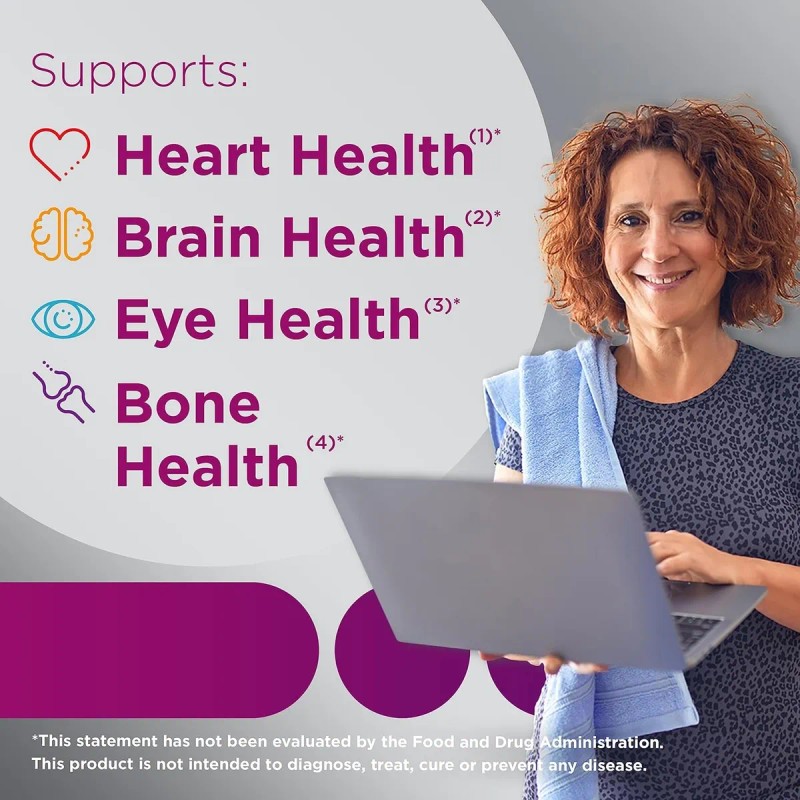 Centrum Silver Women's Multivitamin for Women 50 Plus le ofrece un suplemento multivitamínico/multimineral personalizado que contiene micronutrientes para alimentar sus células y ayudar a mantener el bienestar de todo el cuerpo. Esta vitamina con hierro para mujeres contiene nutrientes esenciales, que incluyen vitamina D y calcio para mantener huesos fuertes y vitaminas B para ayudar a promover la salud del corazón. Este multivitamínico para mujeres mayores de 50 años también contiene zinc como suplemento para la salud del cerebro y vitaminas A, C y E para la salud ocular. Los micronutrientes clave en estos suplementos para la salud del corazón ayudan a llenar los vacíos nutricionales para promover el bienestar y la vitalidad en general. Estas vitaminas para mujeres están verificadas sin OGM y sin gluten. Este multivitamínico con hierro para mujeres presenta una capa suave que lo hace fácil de tragar. Simplemente tome una tableta al día para reponer su cuerpo con vitaminas y minerales esenciales. Ayude a apoyar su cuerpo de la cabeza a los pies con Centrum, la marca n.º 1 recomendada por médicos y farmacéuticos.