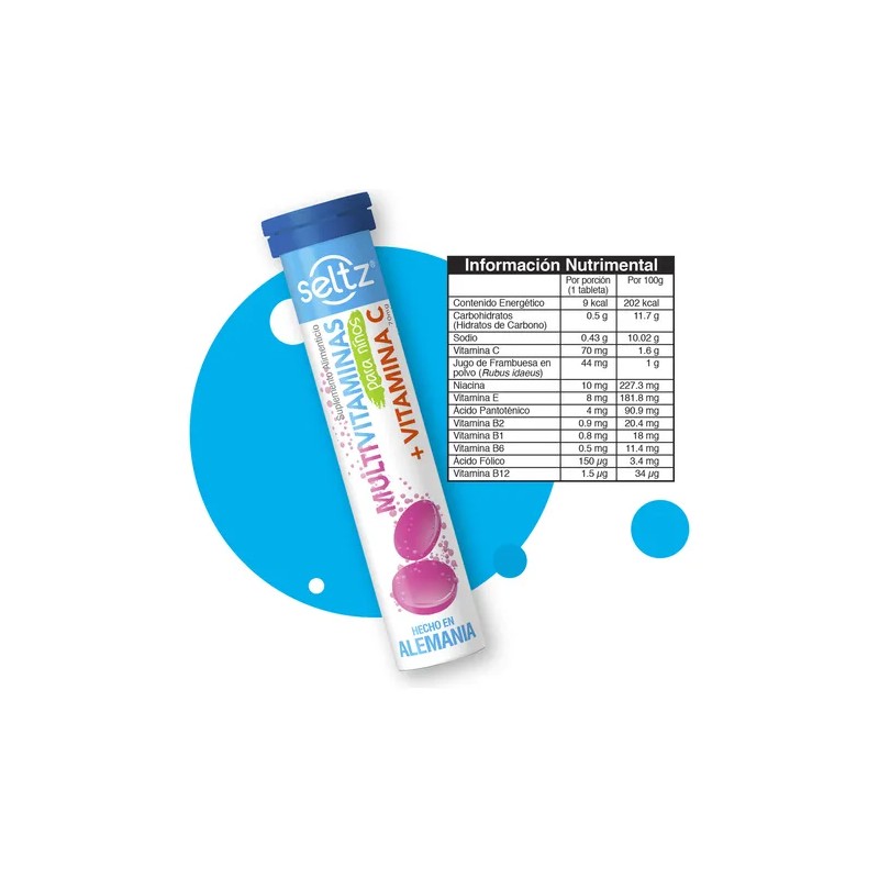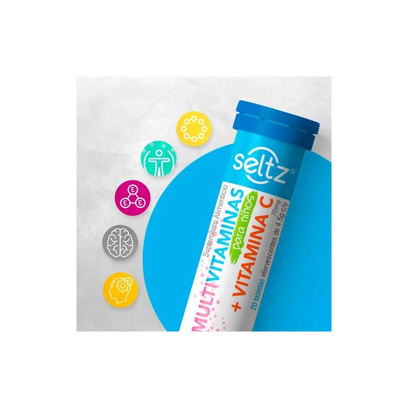 Seltz es un suplemento alimenticio que contiene diferentes tipos de vitaminas, creado para toda la familia, con dos líneas de producto, tabletas efervescentes y bebida vitaminada ligeramente carbonatada.