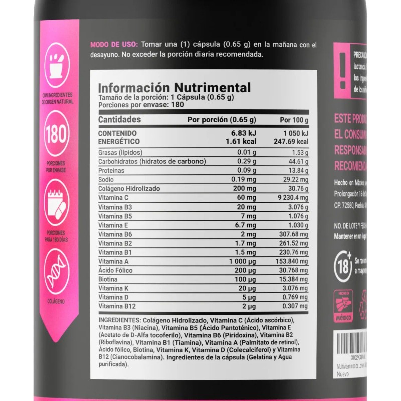 ¡Disfruta la formulación de Womens Blend B Life! Cada cápsula de 650 mg está diseñada para aportar 200 mg de Colágeno Hidrolizado y una mezcla de componentes esenciales para la mujer, como Biotina, Ácido Fólico y un Complejo de vitaminas, elementos que otras fórmulas carecen. Contiene 180 cápsulas.