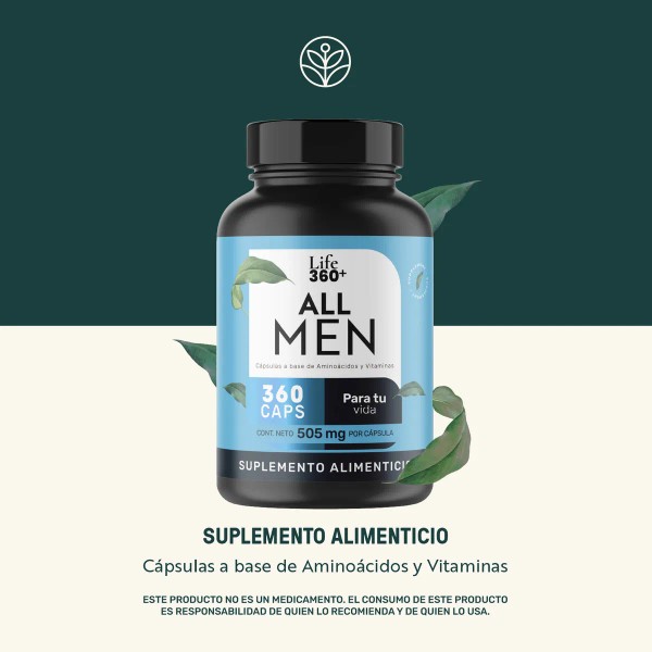 PRESENTACIÓN: LIFE360+ All Men es un suplemento alimenticio en cápsulas a base de aminoácidos y vitaminas con Creatina y L-Arginina que se encuentra disponible en presentación de envase de tarro de plástico con un contenido de 360 cápsulas.