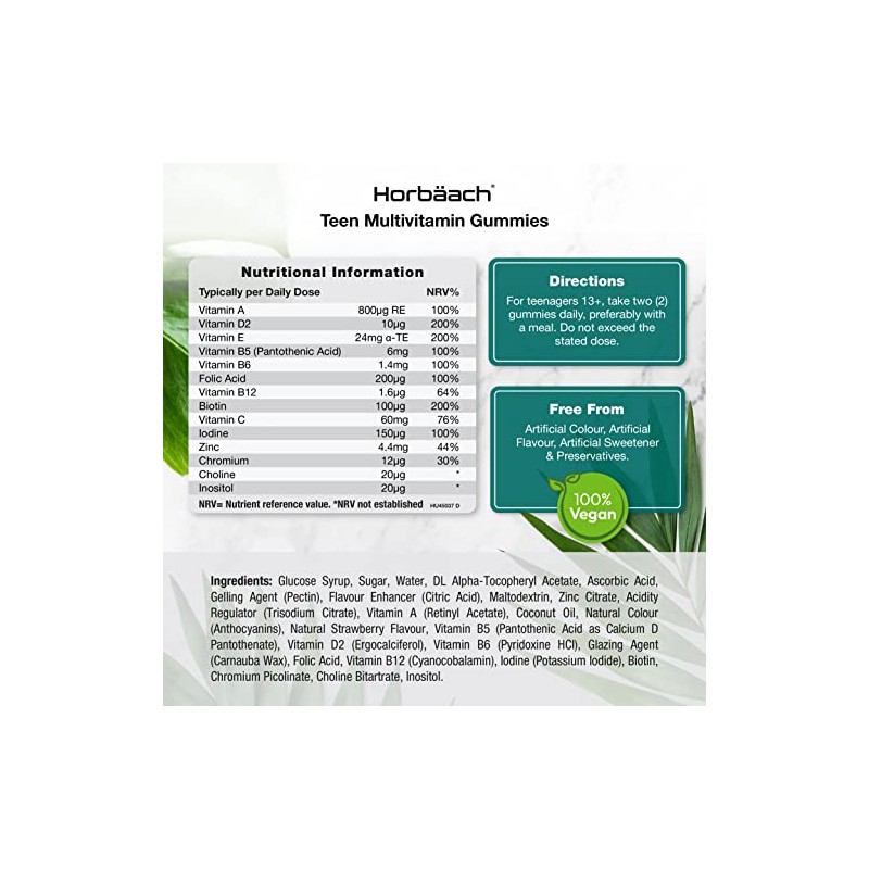 - SUITABLE FOR: Horbaach Multivitamin gummies are vegan and vegetarian friendly, and contain no artificial colours, preservatives or sweetner. It's the perfect formula for teen boys and girls at the best value.