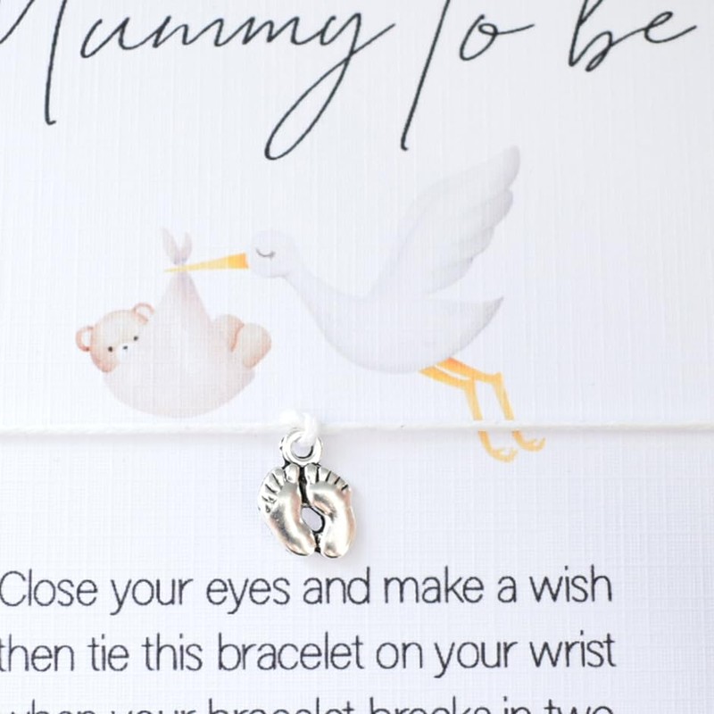 Mummy To Be Wish Bracelet. Cute Stork & Baby. Neutral Design Boy or Girl. Pregnancy Congratulations. New Baby Shower Card. Tibetan Baby Feet Charm. Wish String Cord Bracelet. Modern Greeting Card
