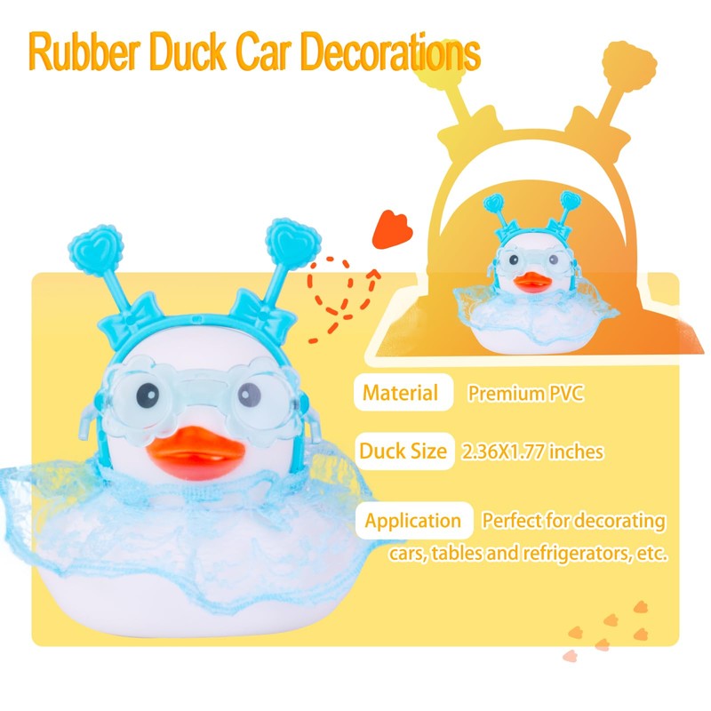 - 🐣 UNIQUE DUCK: The car rubber duck is equipped with a mini hat or headband, sunglasses, and skirt or bow. It is a cute duck to relieve visual fatigue and add some fun while driving.