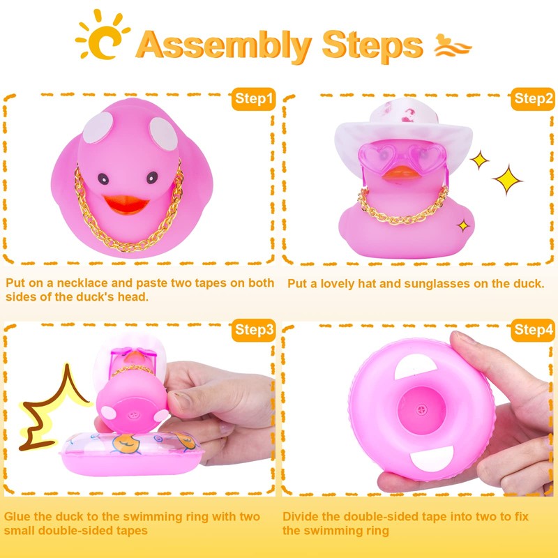- Diversión de bricolaje: ponte el collar y asegura las anteojos con mini cinta, coloca el sombrero en la cabeza del pato, coloca el anillo de natación en la parte inferior del pato y asegura el pato con cinta adhesiva de doble cara. Por favor, ponte en contacto conmigo lo antes posible si tienes problemas de calidad.