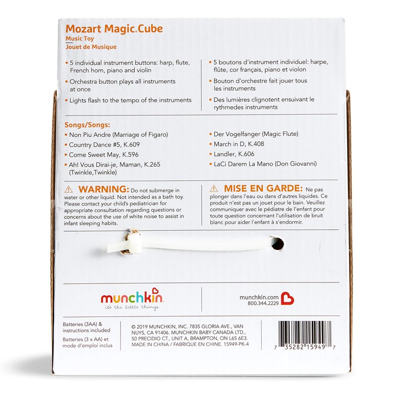 At one point or another, every parent has experienced a particularly loud and headache-inducing toddler toy. But believe it or not, there are toys that make beautiful music too. Perfect for all ages, Munchkin's Mozart Magic Cube inspires creativity and interactive play while teaching how sounds combine to create eight classical music masterpieces by the master composer. With a touch of a button, this interactive cube lets your child add or subtract from any combination of five different instruments, including harp, French horn, piano, flute and violin. Each selected instrument button flashes to the tempo of the music. An orchestra button even plays all the instruments at once. Two volume levels let you choose the right level of sound. The Magic Mozart Cube provides a fun musical foundation for your little one. And that's music to your ears - in more ways than one. Requires three AA batteries (included).