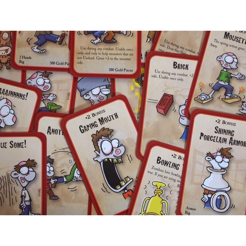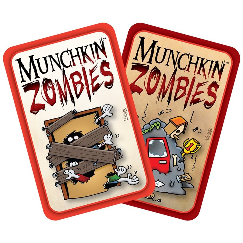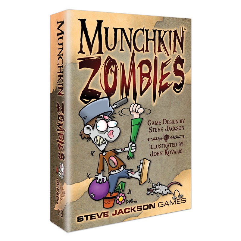 Braaiiinns! It’s the sickest, silliest Munchkin yet! The players are zombies, kicking down doors and eating brains. The “monsters” they’re attacking are people, some helpless and some hazardous, with a few rogue zombies thrown in. The armor is whatever they’ve blundered across during their lurching search for brains. So bravely the munchkins go forth, with mousetraps on their feet and a bowling trophy protecting their poor rotting heads . . . to level up, or to die. Again.