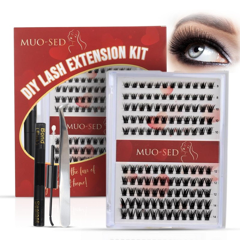 MUO- SED New Lash Clusters Kit Individual Lash Extension Kit DIY Multi-type D Curl Cluster and X series ( Natural, cat eye, volume and wispy volume style) ,Eyelash Extension Kit with Waterproof Lash Bond, Seal Glue and Lash Tweezers (X04- 0.07DMix)