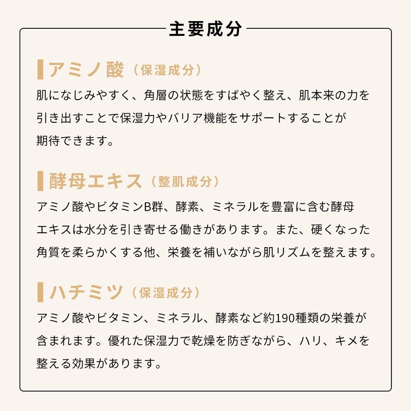 • (3 main ingredients) Amino acids (moisturizing component): Quickly adjust the condition of the stratum layer and bring out the natural power of the skin to support the moisturizing and barrier function. Yeast Extract (Skin Conditioning Ingredient): It attracts moisture, softens hard keratin, and also adjusts skin rhythm while supplementing nutrients. Honey (moisturizing ingredient): Honey contains about 190 kinds of nutrients to prevent dry skin while maintaining firmness and texture. (A delightful aromatic bouquet) The fragrance of the aromatic bouquet, which adds a touch of glamour of jasmine and orange flowers into a refreshing top note. The elegant sweetness will soothe your mind