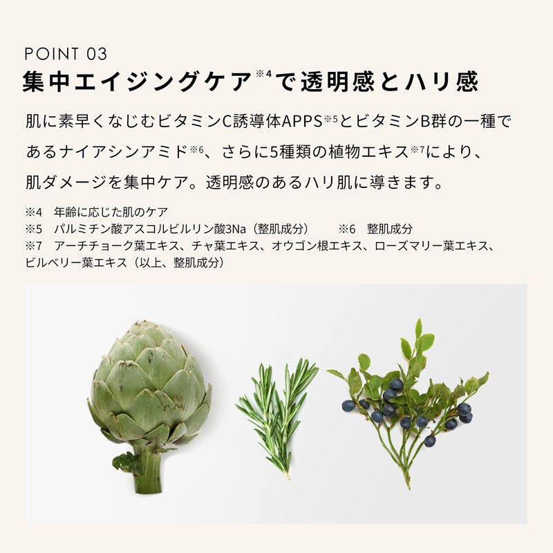 • Concentrated aging care (*4) for transparency and firmness: Vitamin C derivative APPS (*5), a type of vitamin B group, Niacinamide (*6), and 5 types of plant extracts. It leads to a clear and firm skin. (*Care for Age)
