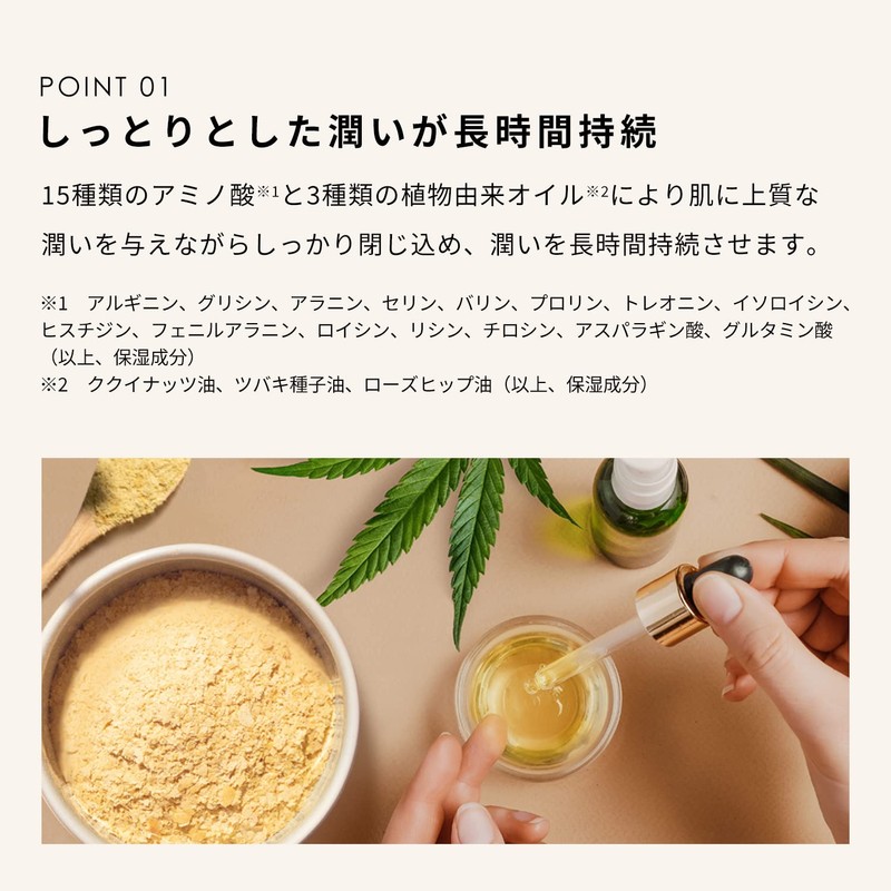 • (Long-lasting moisturizing and moisturizing) 15 types of amino acids (*1) and 3 types of plant oils such as kukui nut oil, camellia seed oil and rosehip oil will trap your skin with a high quality moisturization, keeping it moisturized for a long time