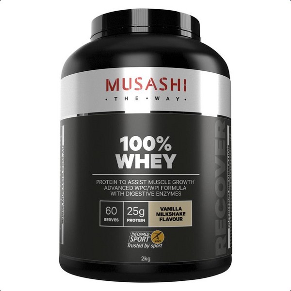 MUSASHI 100% WHEY is a super-premium blend containing synergistic combination of Whey Protein Concentrate and Whey Protein Isolate. This formula acts as an ultimate protein source to meet the needs of athletes and bodybuilders looking to maximise lean muscle and optimise recovery*. This advanced low carbohydrate formula is scientifically designed to support your sports nutrition needs in a delicious formula that tastes great and mixes with ease.