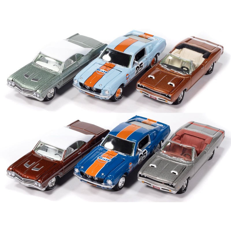 - THIS SET INCLUDES FOLLOWING MODELS: 1) 1969 Coronet R/T Convertible Copper Metallic. 2) 1967 GT-500 #25 Dark Blue with Orange Stripes. 3) 1967 GT-500 #25 Light Blue with Orange Stripes. 4) 1966 Skylark GS Riviera Red Metallic with White Top and Interior. 5) 1966 Skylark GS Seafoam Green Metallic with White Top and Interior. 6) 1969 Coronet R/T Convertible Silver Metallic with Red Tail Stripe and Interior.