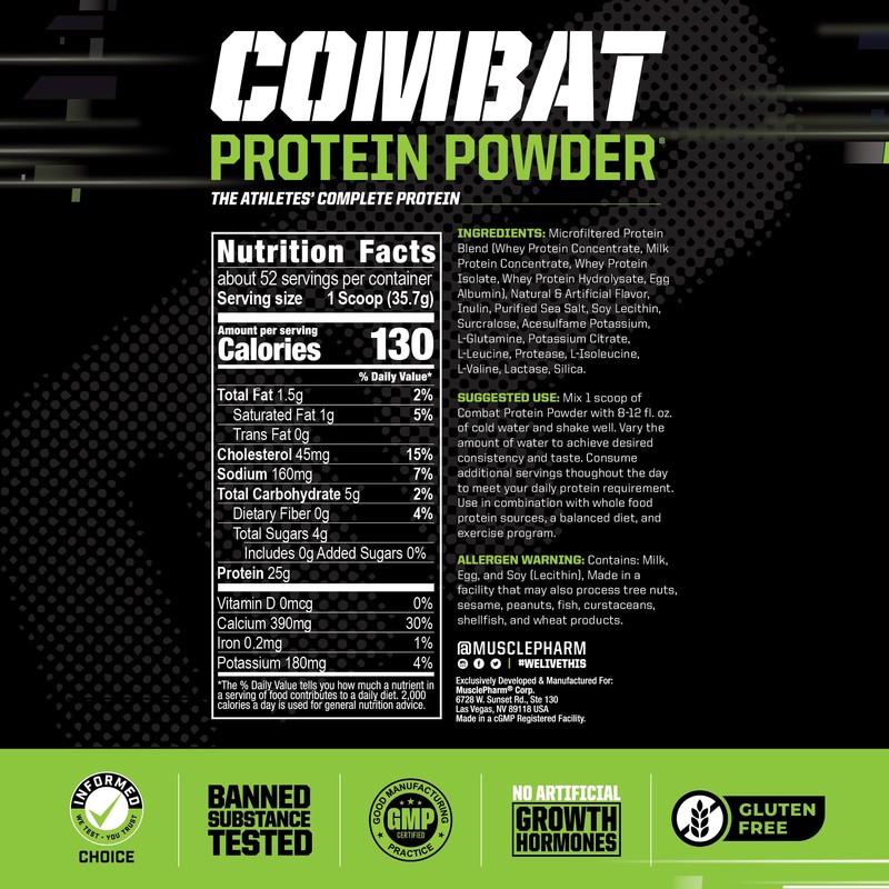 - Fuel Muscles, Yields Results: MusclePharm Combat Protein Powder was created for athletes who train hard and demand more from their body. Combat Protein Powder offers 25 grams of protein per serving.