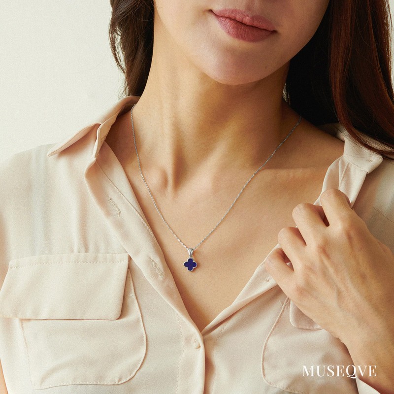 MUSEQVE Blue Four Leaf Clover Necklace for Women • Dainty Royal Blue Stone Lucky Clover Pendant Charm • Rhodium Silver Plated Jewelry with Rose Box Mothers Day Gifts [CVRN-B-S-GW]