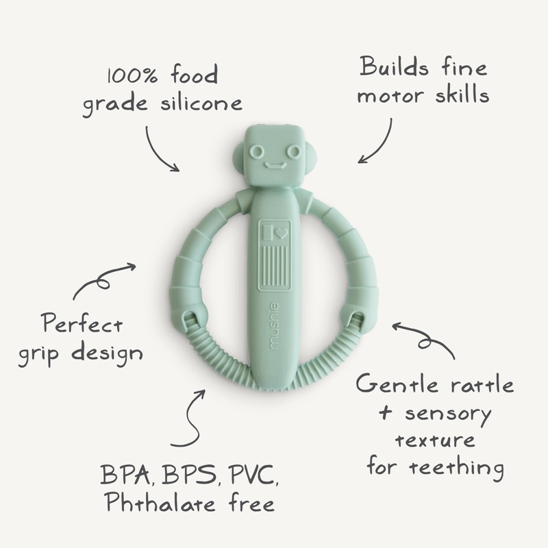 - Soothing Senses: Provide soothing relief with the mushie Rattle Teether, as the cheerful sound engages baby’s auditory senses. Little ones also find it easy to play by grasping handles designed for small hands and a textured silicone surface that massages gums.