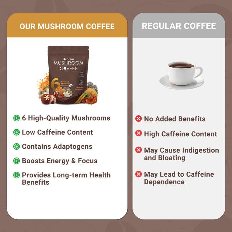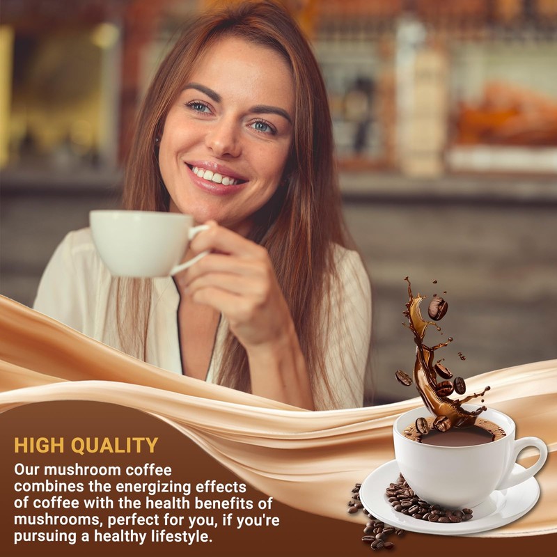 - MUSHROOMS AND COFFEE'S POWERFUL COMBINATION: 6 types of mushrooms are blended with medium-roast Arabica instant coffee powder, allowing you to enjoy a delicious, smooth-tasting coffee. It also helps boost immunity, regulate the digestive system, enhance energy and focus, and provide sustained vitality when consumed daily