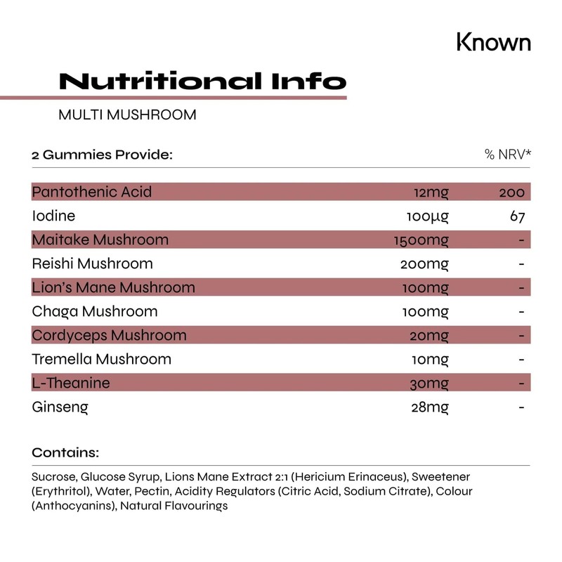 - 🍄 VEGAN-FRIENDLY FORMULA. Known Multi Mushrooms Gummies work from the inside out, and our formula is scientifically developed to encourage optimal absorption and effectiveness. Our Multi Mushrooms Gummies contain only natural ingredients and are free from soy, dairy, gluten, GMO and artificial colours and flavour, ensuring their purity and high quality. They’re suitable for vegan diets.