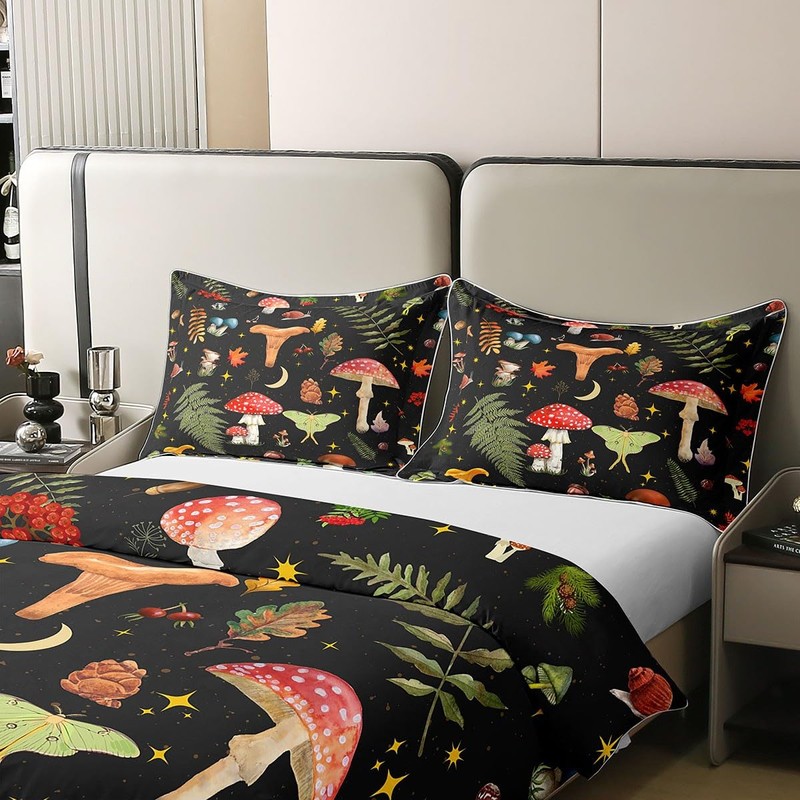 Mushroom Duvet Cover 100% Cotton Lovely Cartoon Wild Butterfly Dreamy Bedding Set for Kids Teens Adults Glitter Stars Jungle Leaves Rustic Style Comforter Cover with 2 Pillowcases King Size 3 Pcs