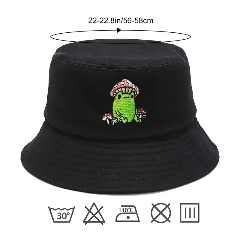 Mushroom Frog Embroidery Black Bucket Hat Beach Sun Hat Fishing Hat for Women Men Summer Sun Protection Fisherman Hat