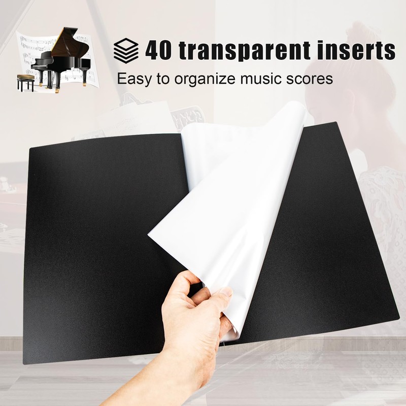 - Product includes: the product contains 1 black music folder and 10 sheet music clips. This folder has 40 transparent inserts. Easily organize sheet music, ideal for musicians, performers, music lovers or beginners.