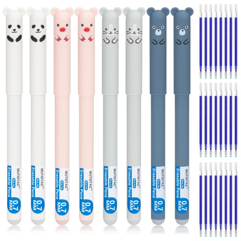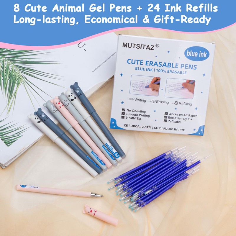 Mutsitaz Erasable Pens Blue Ink – 8pcs Cute Animal Friction Pens with 24 Refills, 0.7mm Rub Out Gel Pens for School & Office Supplies