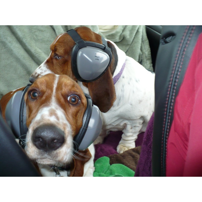 Mutt Muffs - hearing protection for dogs. Inspired by pilots who know the noise level of the cockpit is unsafe for man or beast.... Mutt Muffs offer hearing protection for your four-legged family members. Your dog's keenest sense is smell and number two is hearing. If you think something is loud, your dog is probably in pain. After heredity, long exposure to loud noise is the biggest contributor to deafness. Good news though... noise-induced hearing loss is different in one very important way... it can be reduced or prevented altogether. The inner foam that used is the exact same ester resin foam that is found in many high end commercial head sets designed for humans. Based on the materials used, the estimated decibel reduction is between 21 and 24, assuming proper fit and a good seal against your pup's head. That's 21-24 dB reduction in the human hearing range of 20,000 cycles per second. Our canine friends can hear much higher frequencies (in the range of 43,000 cycles per second). As the frequency goes up, so does the effectiveness of Mutt Muffs, simply because the higher the frequency, the more easily it is absorbed. Therefore, Mutt Muffs are especially effective at protecting against the high frequency wind whistles and shrieks humans cannot even hear. There is another factor that comes into play as well. The dog's own ear flaps are down and covering the ear canal, providing yet one more layer of protection.
