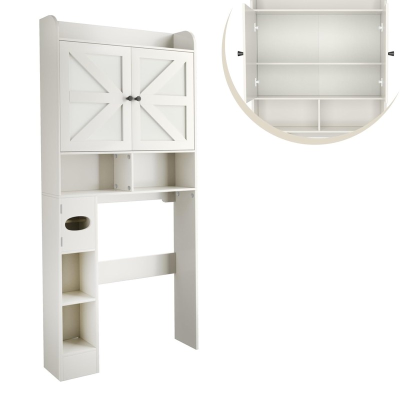 - 【Modern Style Over Toilet Storage】This white over the toilet storage cabinet is made of high-quality engineered wood. The modern and simple design that suits most styles of bathrooms and laundry rooms.This over the toilet shelf comes with 2 anti-tip kits that secures to the wall for added safety and stability.