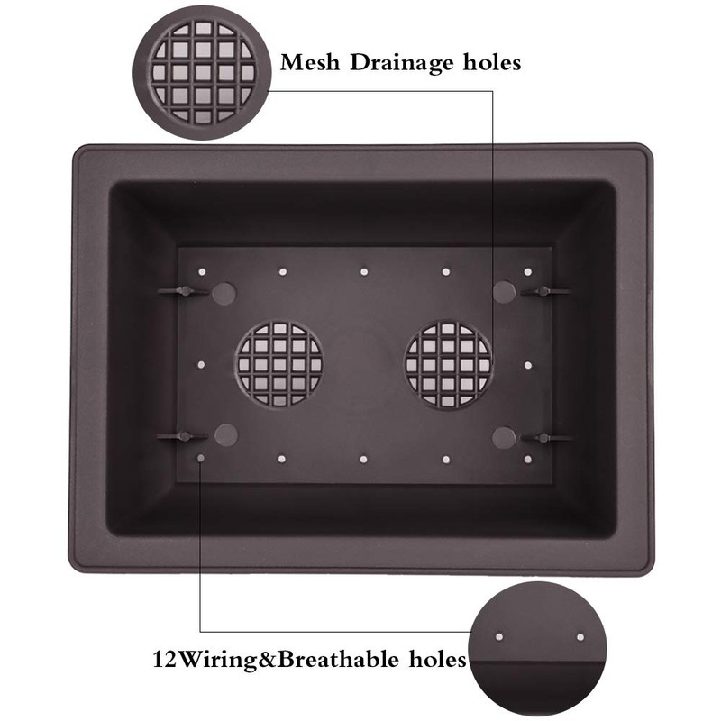 - Design: 2 Screened drainage holes and 14 wiring holes at the bottom