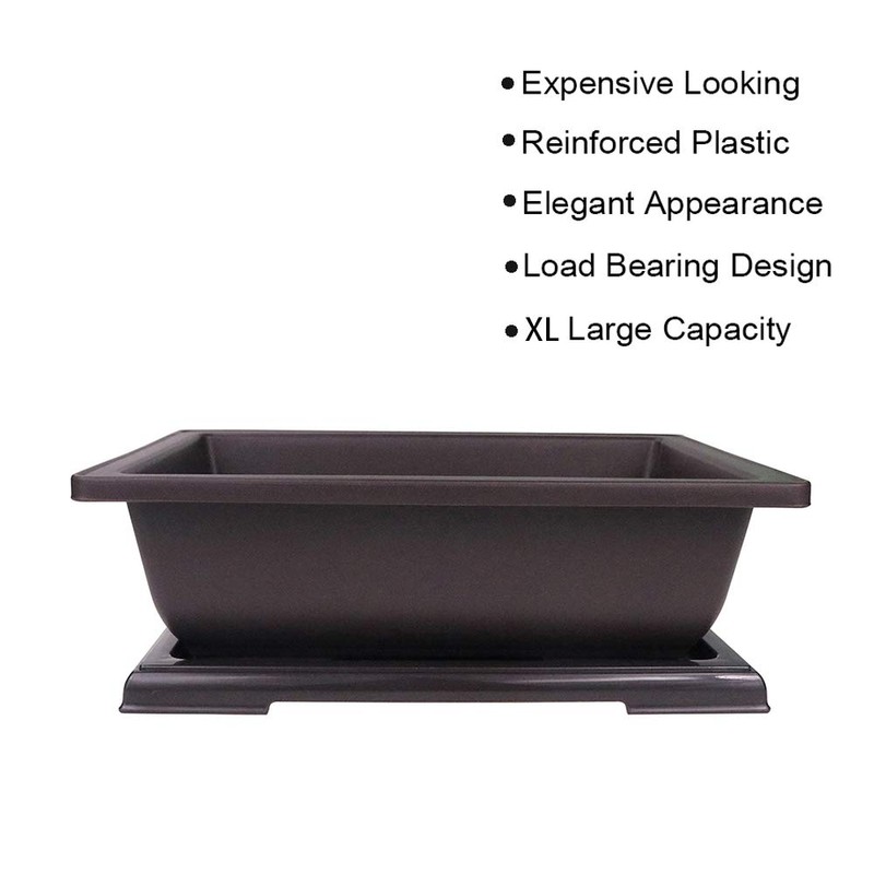 **Brand:** MUZHI **Color:** Mocha,Nice and Steady,basic style. **Size:** 10.1*7.5*3.2 INCH(out DIA L*W*H); 9*6.4*2.8 INCH(inner DIA L*W*H),XL Large Rectangular Bonsai Pot **Material:** PP Plastic,Strong and Reusable, Expensive-Looking **Feature:** Sturdy,Grid Bottom Well Drainage,Matte Finish,Beautiful Rectangular Cactus or Bonsai Tree Pots Succulent or Sedum Arrangement. The large shape and rolled edge is more suitable for series DIY succulents home planter or Large bonsai tree planting Pot.Easy for operation,Heavy duty design, edge is gentle no hurt to your succulents or plants.High feet and grid bottom there are enough space for ventilation. **Service:** Worry Free Shopping Service, Any queations please feel free to contact us.You can click the button "contact seller". Your best planting containers partner,Do not miss it.