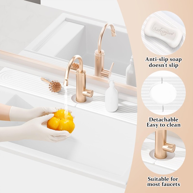 • 【Sink Mat & Organizer】 : tone drying mat for kitchen counter, which can hold toothbrushes, cups, soap, dishwashing sponges and other items that need to be dried. Say goodbye to the stains on the faucet and keep the countertop clean and dry.