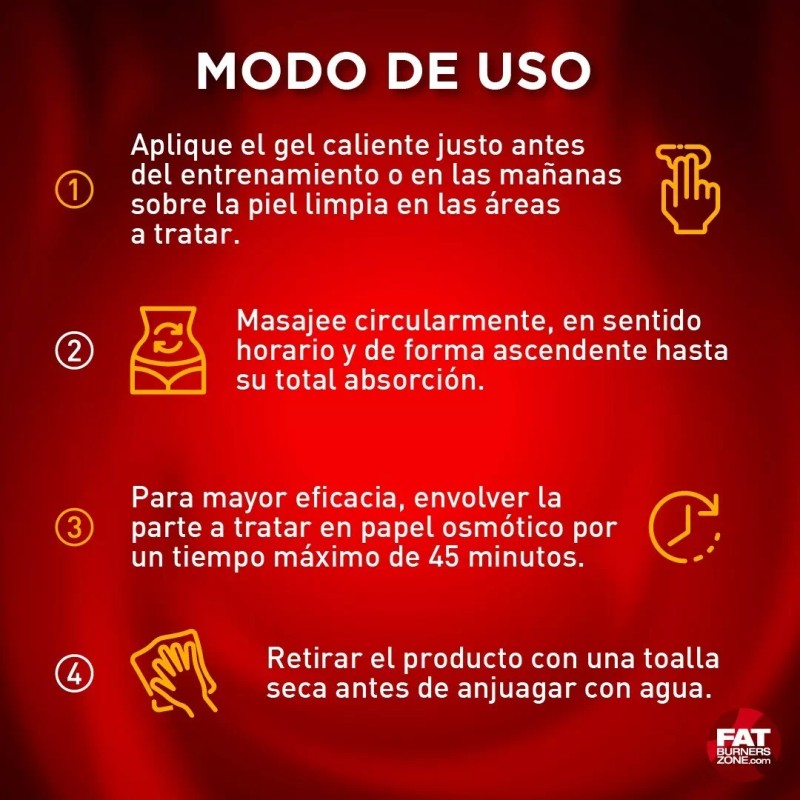 Aplique el gel caliente justo antes del entrenamiento o en las mañanas sobre la piel limpia y las áreas a tratar.