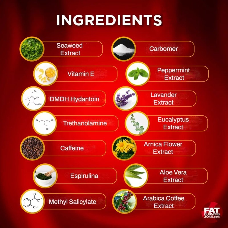 Algae extract Carbomer, Vitamin E, Peppermint extract, DMDM Hydantoin, Lavender extract, Triethanolamine, Eucalyptus extract, Caffeine, Arnica flower extract, Spirulina, Aloe extract, Methyl salicylate, and Arabica coffee extract.