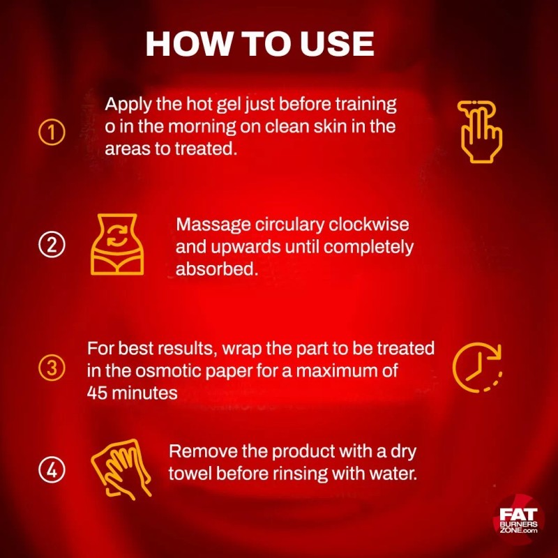 Apply the hot gel to clean skin and the areas to be treated just before training or in the morning.