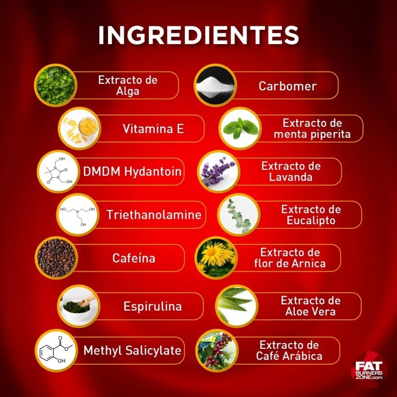 Extracto de alga, Carbomer, Vitamina E, Extacto de menta piperita, DMDM Hydantoin, Extracto de lavanda, Triethanolamine, Extracto de eucalipto, Cafeina, Extracto flor de árnica, Espirulina, Extracto de aloe, Methyl salicylate y Extracto de café arabica.