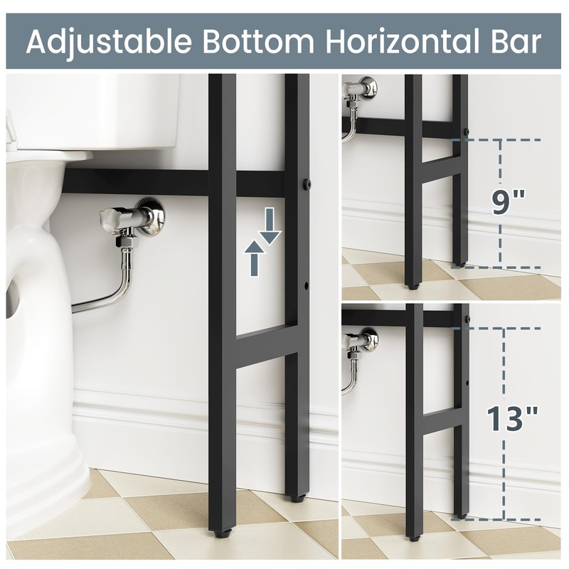- Optimize Your Bathroom Space: This over the toilet storage cabinet (67.32'' H x 23.23'' L x 7.87'' D) is designed to free up bathroom countertops and tap into the vacant area above the toilet. It provides ample room for all your bathroom essentials. With a clearance of 34.57" from the floor to the bottom shelf, this storage rack fits over most standard toilets.