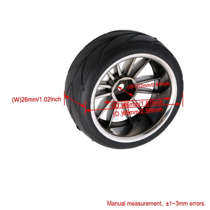 - Dimension Details: Rim: Hex Hub: 12mm/0.47" Tire: 65x26mm/2.55x 1.02" (DiaxW) Please make sure the size is right before purchase