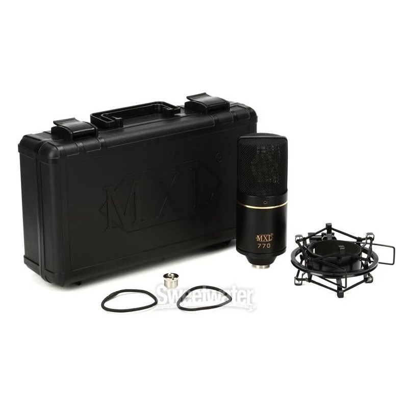 An easy choice for producers, musicians, and content creators looking to add a reliable, high-quality condenser to their gear vault, the MXL 770 is a no-nonsense large-diaphragm condenser microphone offering superior recording capabilities for vocals and instruments alike. By utilizing a FET preamp and transformer-free balanced output, the 770 captures audio with a fantastic balance across all frequencies and a clear, open high end. Toggle on the 770's low-frequency roll-off switch, and you'll bask in a pure, untainted sound free from excessive noise and bass rumble. Its natural and versatile cardioid pickup pattern works exceptionally well when tracking vocalists, stringed instruments, and pianos, imbuing each take with a beautiful warmth and clarity that belie its affordable price tag. And with its built-in -10dB attenuation switch, you can be sure that the 770 is more than capable of holding its own against any sound source imaginable. Its usability goes far beyond music, making it an ideal mic choice for recording podcasts, voiceovers, and any other application where top-quality sound is crucial. Plus, each 770 comes in a rugged hardshell case with a custom foam interior along with a sturdy and stable shockmount — all you need is a mic stand and XLR cable, and you're ready to record like a pro!