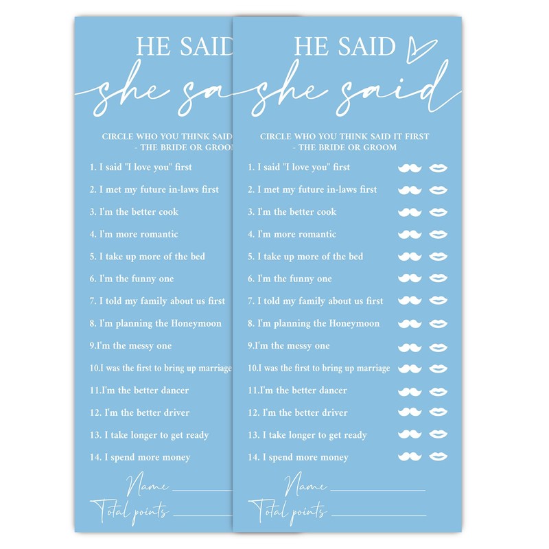 MXLINSW Minimalist Blue Wedding Shower Games Cards, He Said She Said, Bridal Shower Games, Engagement Party Wedding Card for 25 Guests, Bridal Party Supplies 4x9inch-A17