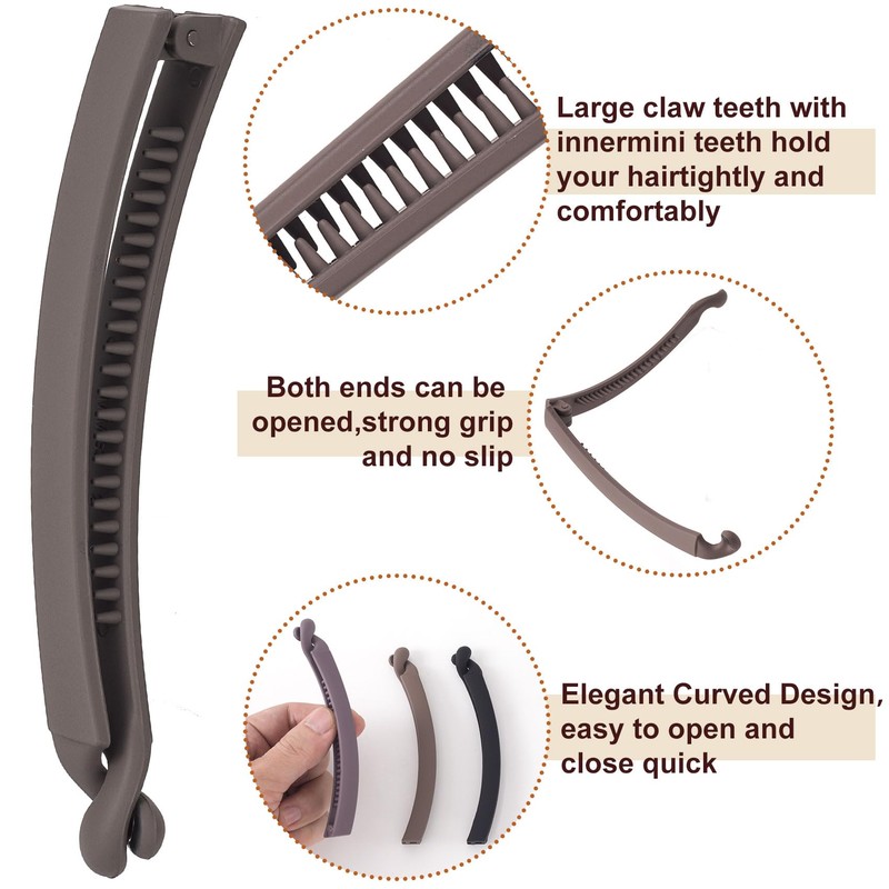 - Package Include: You will get 3pcs banana hair clips in purple, dark coffee and black. The different colors allow you to change your hair accessory based on different outfits.