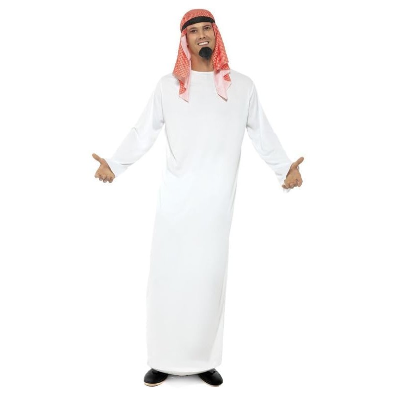 - MENS OUTFIT INCLUDES: This complete sheik costume comes with a flowing white long tunic, a traditional red and white headdress, and a black sheikh beard, providing you with the complete Middle Eastern look.