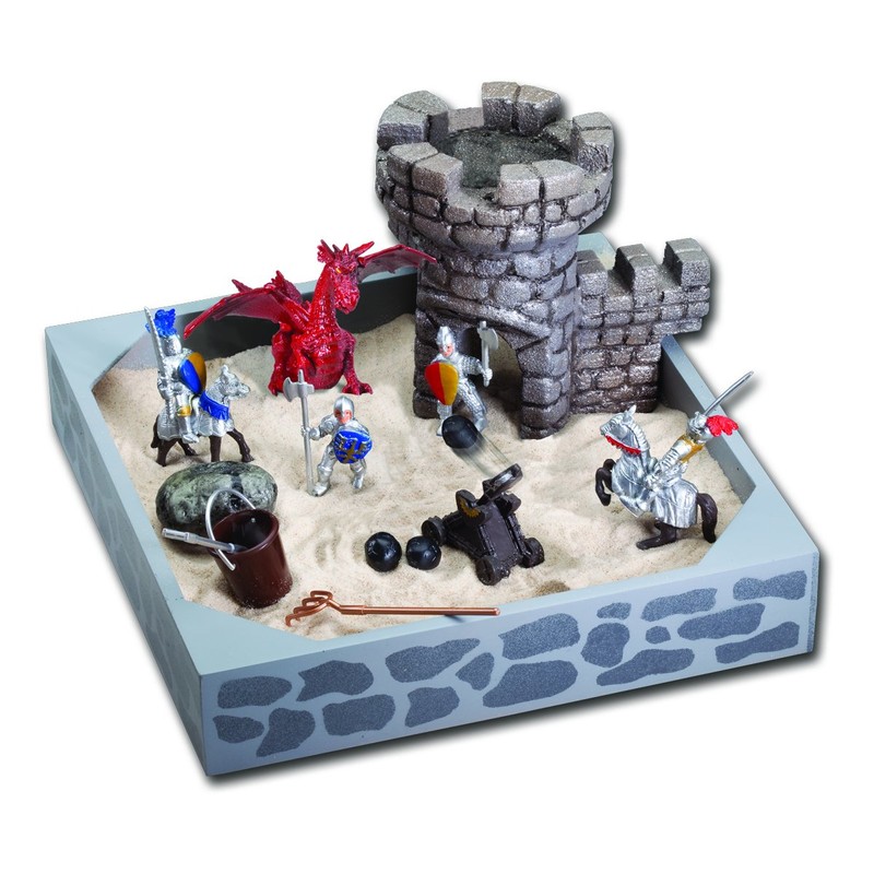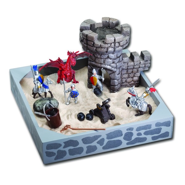 - Set includes 10 10 x2-inch sandbox, 20 20 inch no mess play mat, ultra fine sand, Medieval Tree, Knights in Shining Armor, Cavalry Horses, Fire Breathing Dragon, Castle with Draw Bridge and Moat, Grooming Rake, Shovel, Pail and Large Rock