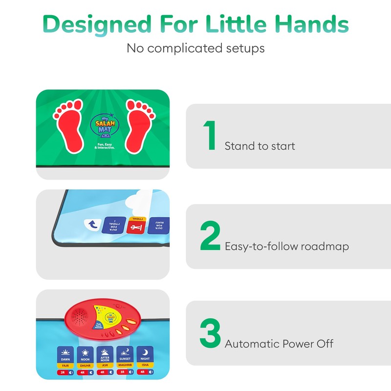 - Salah Mat will guide the user through two rakat of salah only (sample for prayer times only) using a simple to understand format. Requires 3 x AA Batteries (Not Provided)