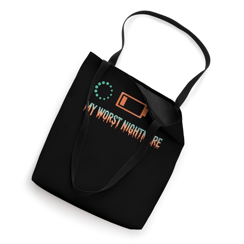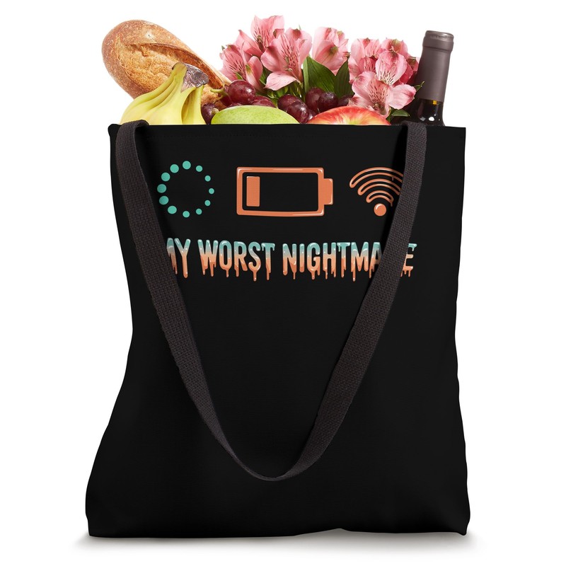- Show off your tech savvy style with this playful design featuring a loading circle, low battery icon, and wifi symbol above the text 'MY WORST NIGHTMARE'. Perfect for gadget lovers, teens, and young adults who enjoy witty tech humor and relatable nerdy