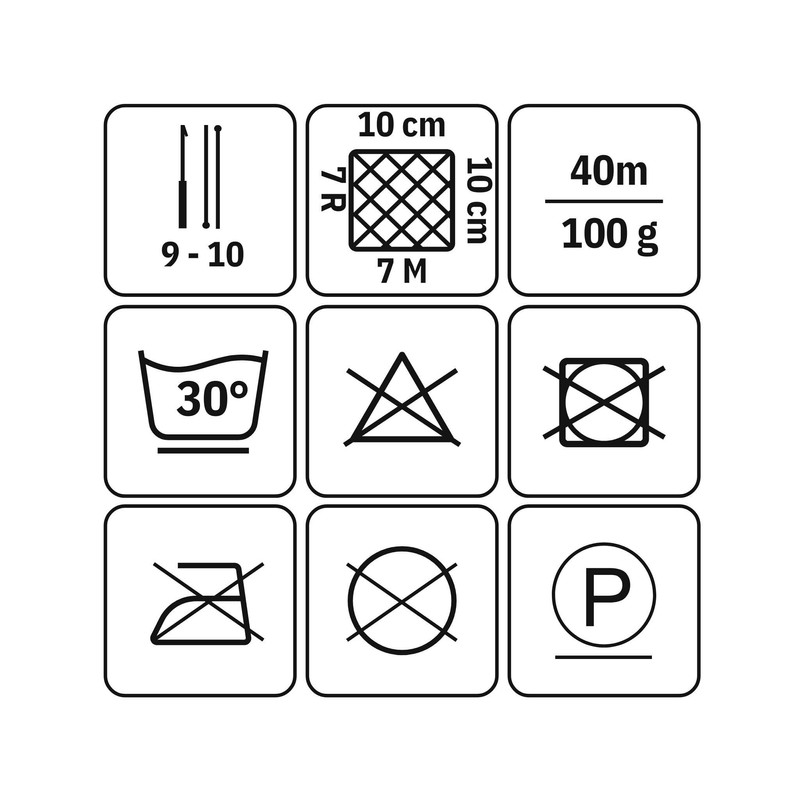The soft yarn can be washed by hand at 30 degrees, has a weight of 100 g per ball with a running length of 40 m. For processing, the needle size 9 - 10 mm is recommended.