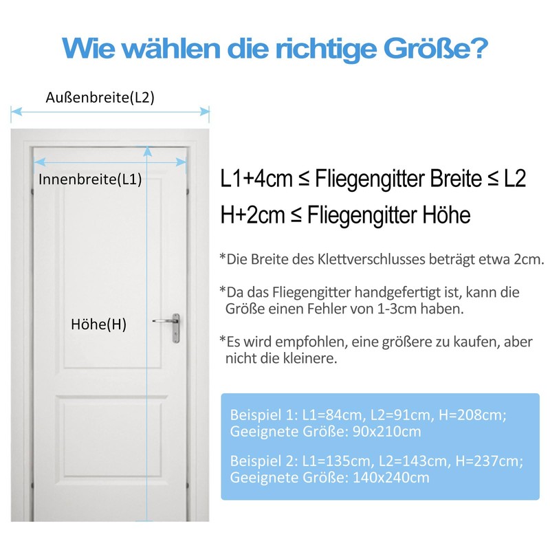 - Easy adhesive installation without drilling. The fly screen door can be easily and quickly attached or removed with adhesive strips (included). With supplied nails can be used for the wooden door. The 180 x 210 cm fly screen balcony door is suitable for the door, whose inner frame within 176 x 208 cm (cannot be cut).