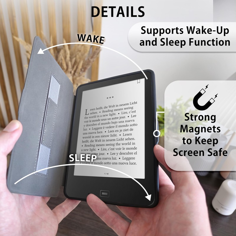 - Sleep/wake function: thanks to a narrow magnetic strip in the flip case, the cover closes reliably and supports the automatic sleep function of the e-reader. When the lid is closed, the pad goes to sleep and turns on again when opened.