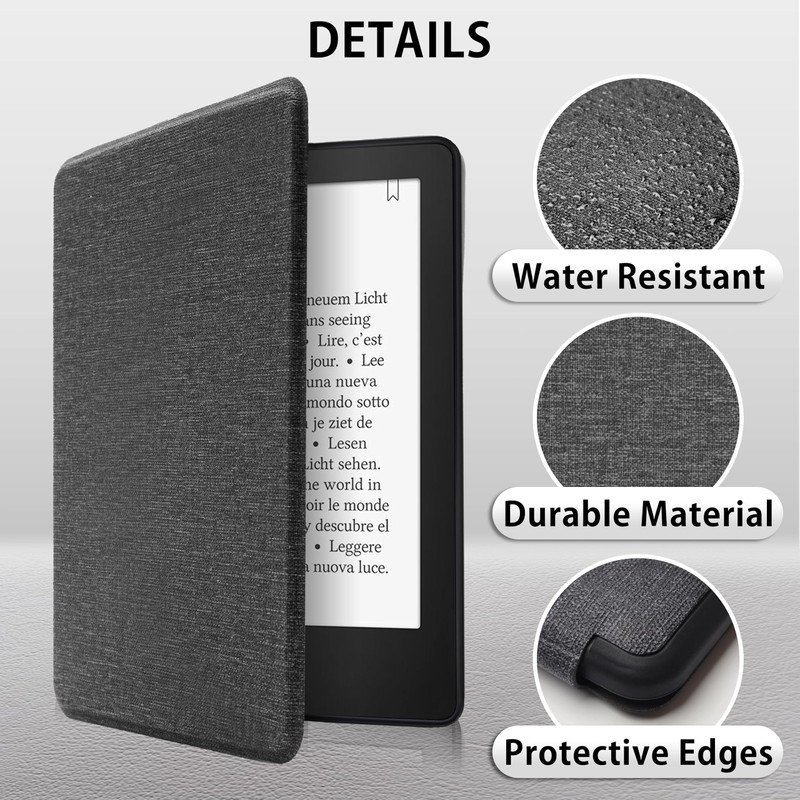 - Design: an elegant look and high-quality fabric pattern make the case a real eye-catcher. The accessory closes without additional straps, tabs or straps and provides access to the charging port so you don't have to remove your Kindle from the book-style soft case for charging.