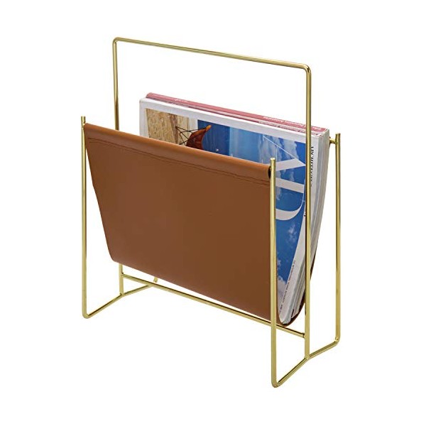 MyGift Modern Caramel Leatherette Magazine Holder Floor Standing Sling Style Rack with Brass Tone Metal Frame
